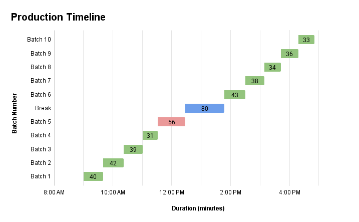 Monitor batch performance, identify downtime, and uncover process inefficiencies with our intuitive production dashboard. Track timing, duration, and gaps between batches in real time.